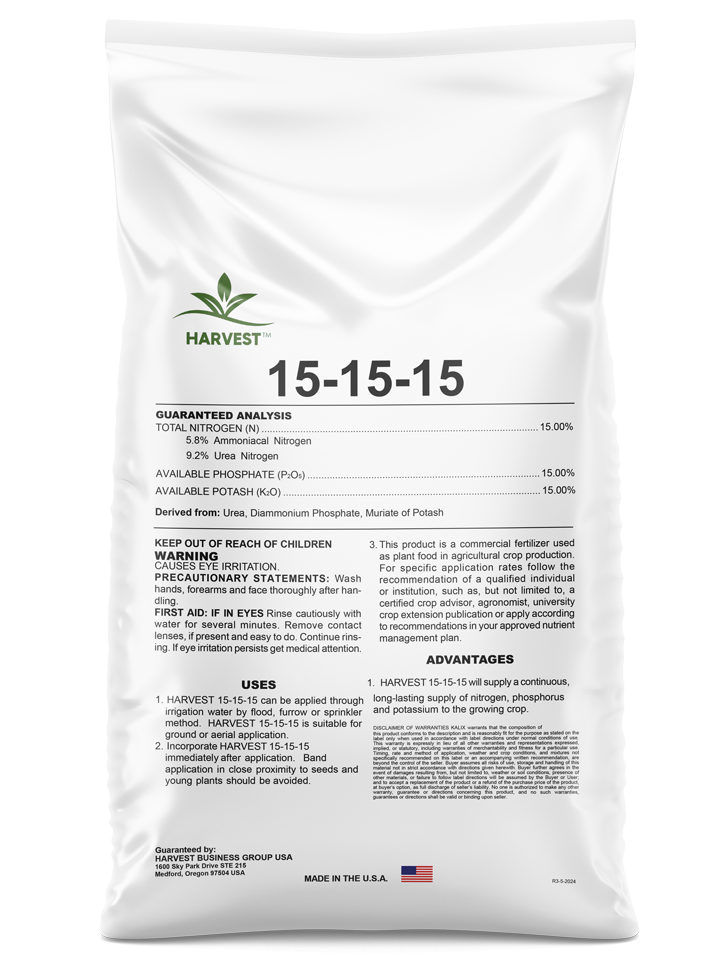1. HARVEST 15-15-15 fournira un apport continu et durable d'azote, de phosphore et de potassium à la culture en croissance.
